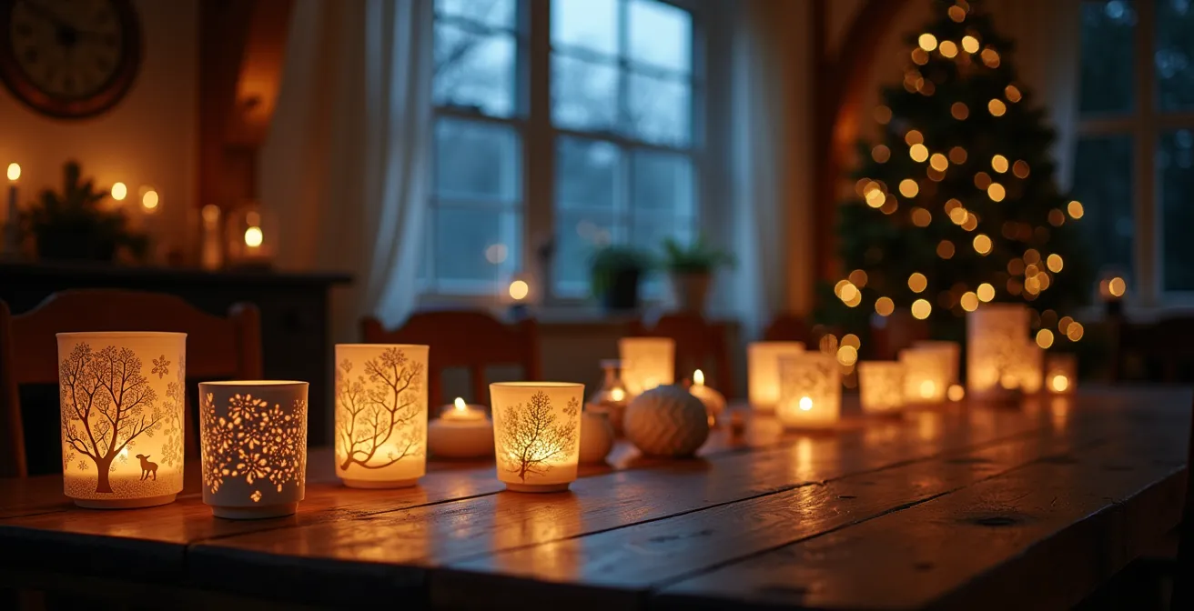 Cette dimension psychologique entre en résonance avec le symbolisme traditionnel des couleurs, particulièrement fort pendant les fêtes de fin d’année. Le rouge, le vert, l’or et le blanc ne sont pas de simples choix décoratifs ; ils sont porteurs de sens. Une analyse montre que près de 94% des décorations traditionnelles françaises utilisent ce quatuor chromatique. Un photophore rouge ne diffuse pas seulement une lumière chaude, il évoque la passion, la vie et l’esprit de Noël. Un photophore doré évoque le luxe, la célébration et la lumière divine. En choisissant la couleur de votre verre teinté ou de votre papier calque, vous infusez votre lumière d’une couche de signification supplémentaire, créant une ambiance qui est à la fois sensorielle et symbolique.