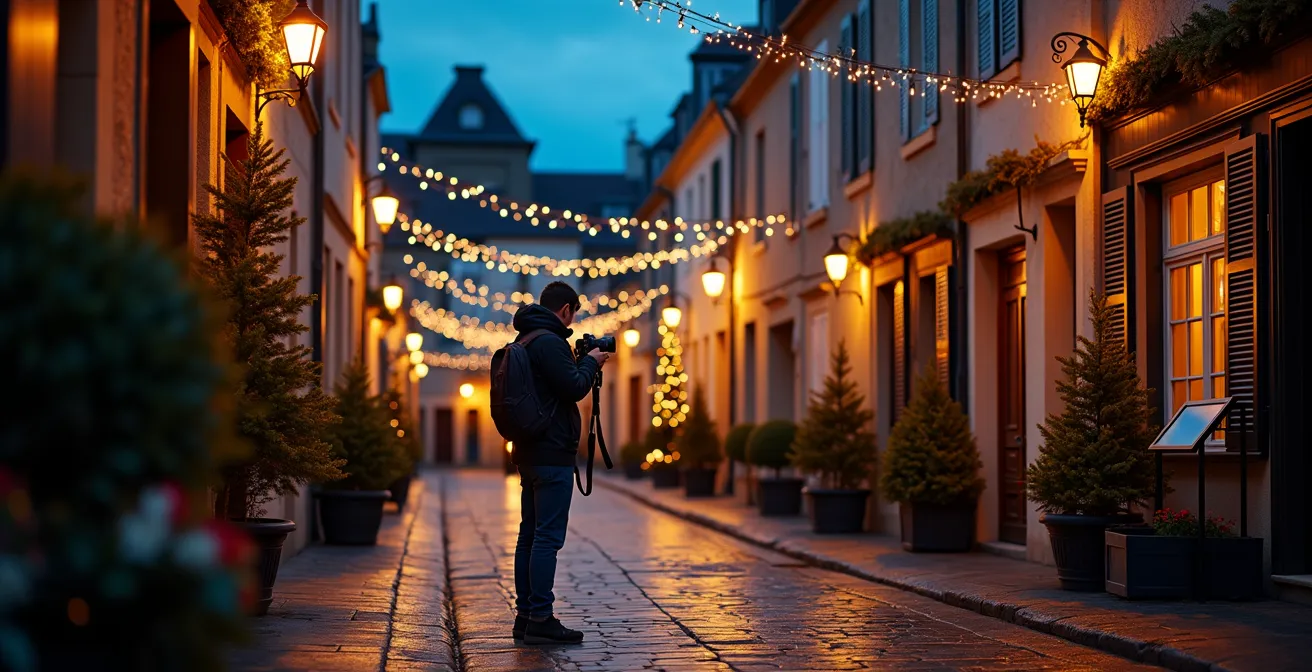 Photographe capturant les illuminations de Noël pendant l'heure bleue en ville française